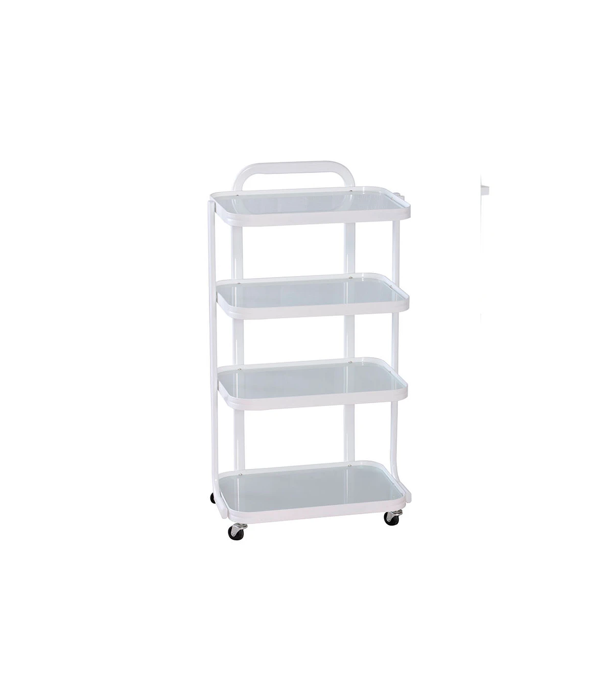 This beauty furniture features a white-painted metal structure, giving it a clean and professional appearance. Furthermore, it is equipped with four glass shelves that provide ample space to store all your beauty products and tools.
