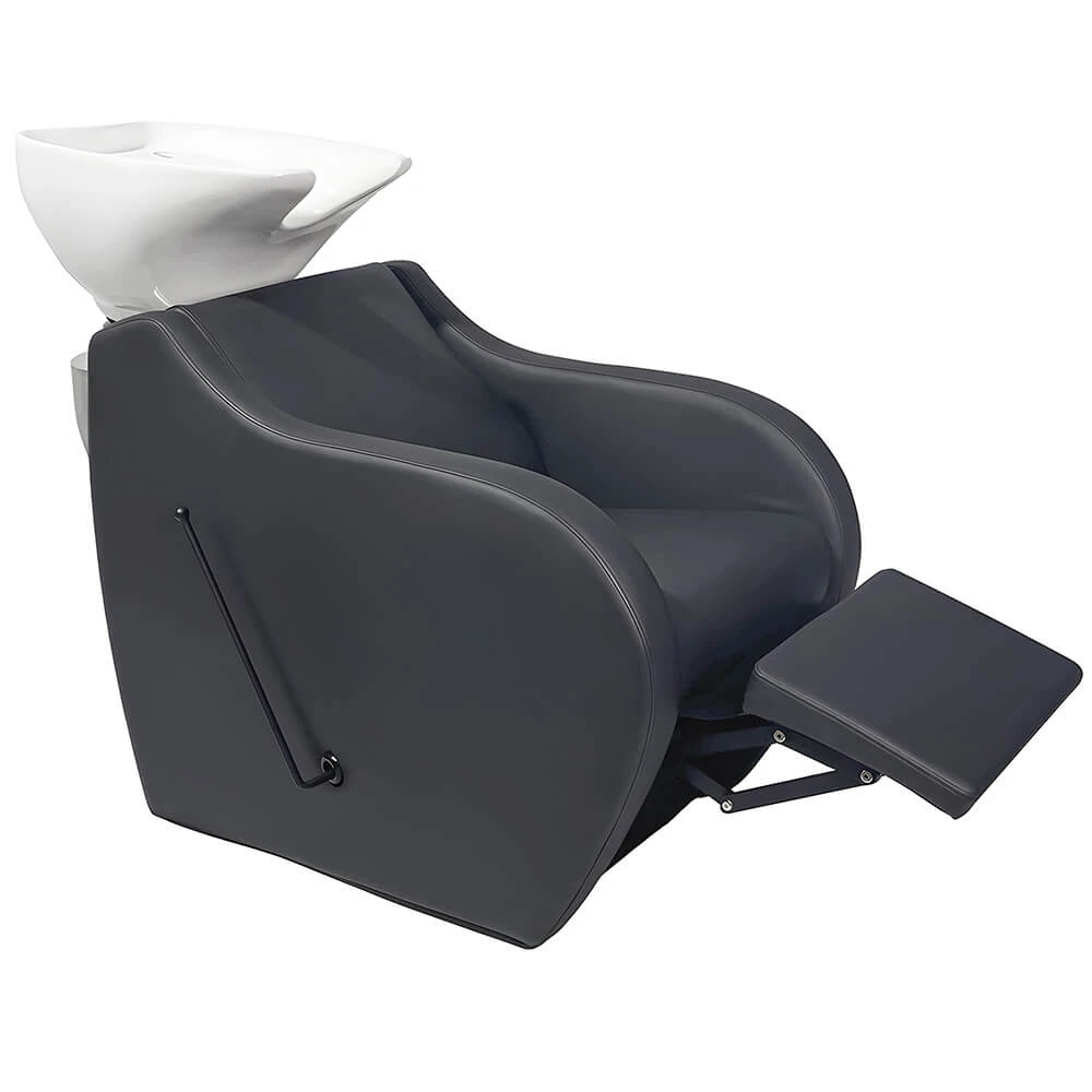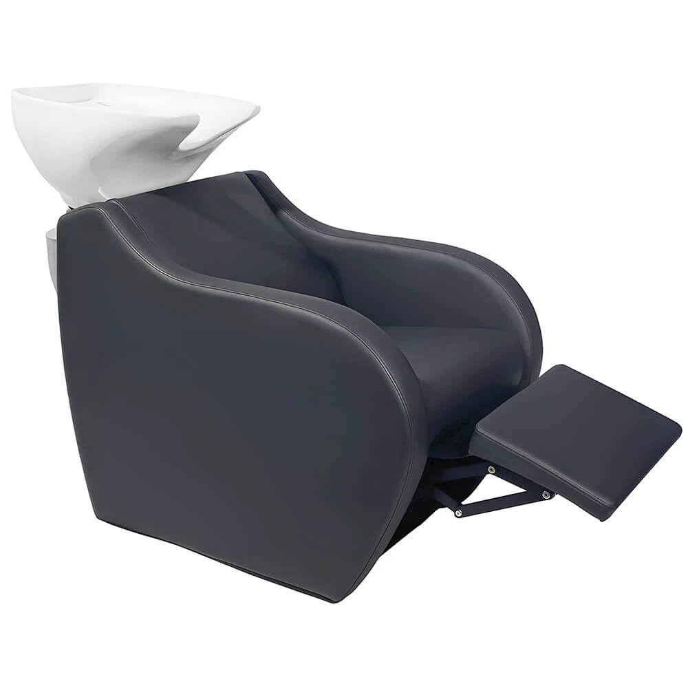 La tipología de chaise-longue permite al cliente tumbarse cómodamente durante el lavado de cabeza. El reposapiés eléctrico se acciona fácilmente mediante la botonera integrada. El respaldo del sillón se puede desmontar con facilidad para proceder a la instalación de la pica lavacabezas.